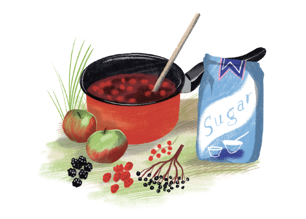 It's time to get picking. Any combination of berries will do, but if you chuck in some peeled and cored apples it'll help the jam to set. You'll then need to get your fire nice and big; let it burn down for a while until it's mostly white-hot embers as this will stop the flames from licking the side of the pan leaving a burnt-on jam patch that'll never come clean. While the fire is roaring away, measure out an approximately equal volume of sugar and fruit and mix them up in your pot. If you haven't found any apples, or if you like the belt-and-braces approach, use jam sugar for a definite set. Sit and mush to your heart's content, or not, if you want whole berries in your jam. Place the pot on the fire until the fruit and sugar start to bubble and boil. Eventually you'll see that it's starting to get thicker. Take the pan off the heat and let it cool for 5-10 minutes. Your pan will invariably become blackened by soot, so bring a plastic bag to store it in on the way home. Enjoy!